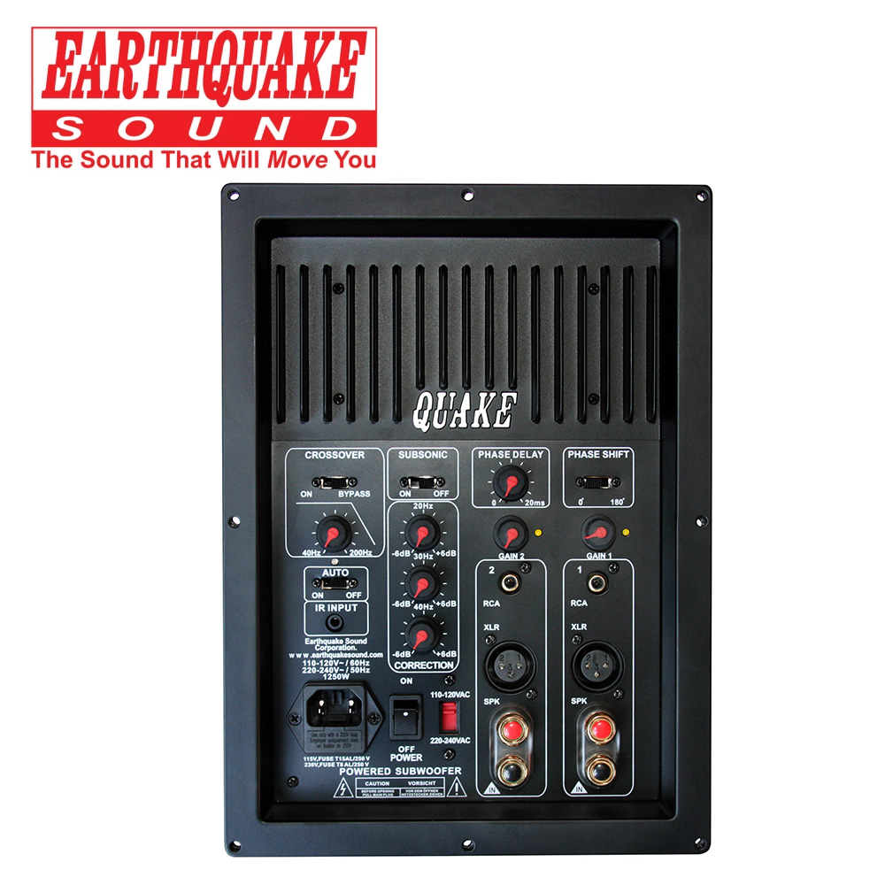 The IQ-1500 offers a room correction technique that surpasses that of all previous attempts. The intelligent “Back EMF” drive circuit interacts with the subwoofer design and memorizes system tuning frequencies and system type. The information which is stored in the microprocessor turns on a preset group delay curve that serves as a correction reference. This information deals only with time correction that moves the peaks and the dips in a room to a flat. Once that is achieved the user will resort to the final correction- EQ the room. For that reason Earthquake’s is truly an intelligent system. 20Hz, 30Hz and 40Hz frequencies can be cut or boosted by a whopping 6dB. These corrections help in producing wider range of listening position that is unprecedented for the room. Please note that boosting the response at 20Hz is very demanding for a subwoofer. Consult with your subwoofer maker, and determine if their subwoofer is designed to take a boost at such low frequencies.