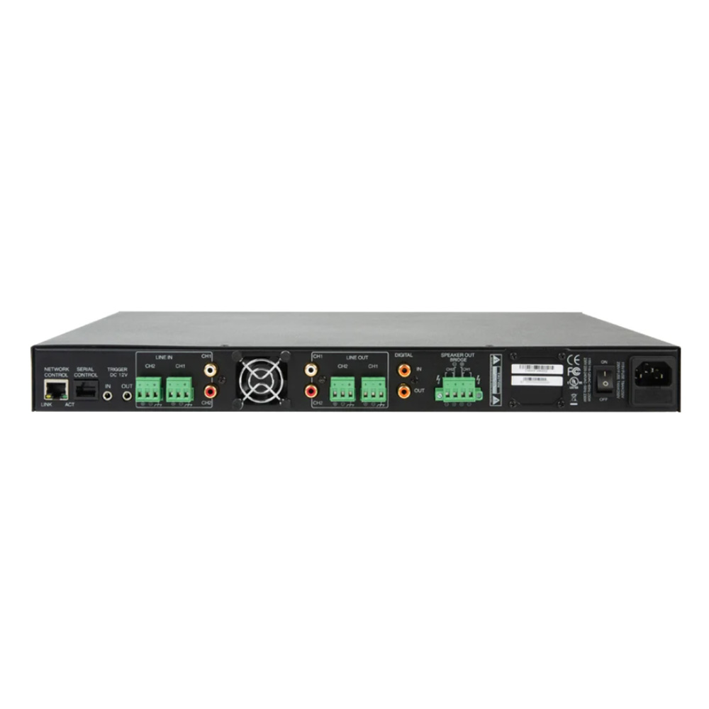 This professional amplifier delivers premium performance for even the largest speaker systems. Install high-powered versatility, with two configurable output channels to support 70V, 8-ohm, and hybrid configurations (2-ohm minimum).
