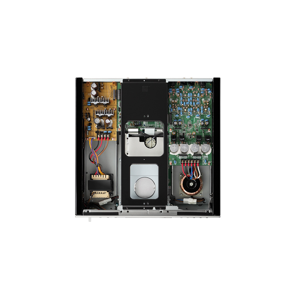 The CD-S2100 has completely symmetrical construction: the rotating loader mechanism is in the centre, the digital power supply and circuit board are on the left side, and the analogue power supply and circuit board are on the right. Completely isolating the digital unit and the analogue unit eliminates detrimental impacts of interference between the circuits, while achieving ideal weight balance. The centre frame that extends from the front to the back of the body and the front panel made of 5mm (1/4”) thick aluminium increases rigidity of the entire chassis and ensures stable disk play.