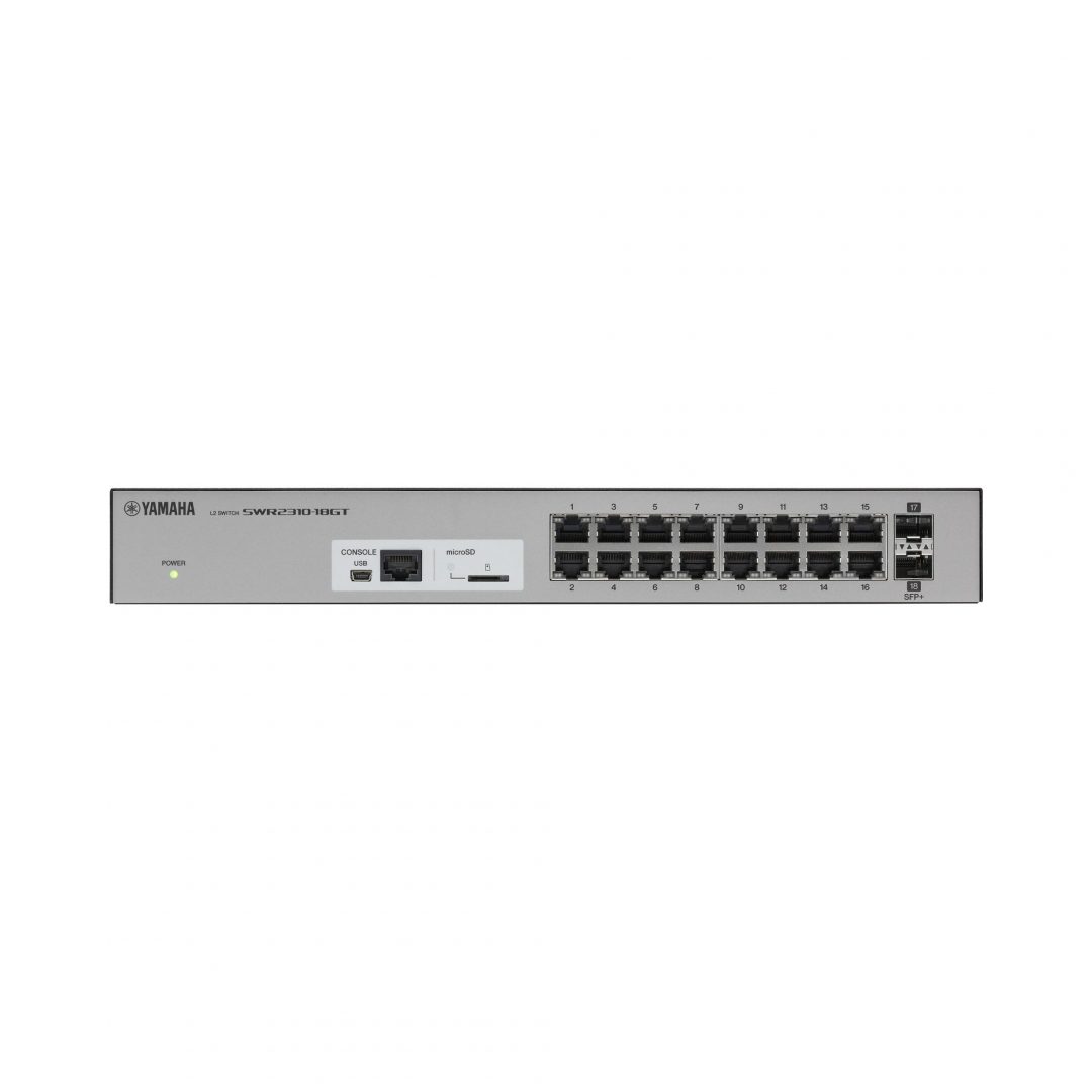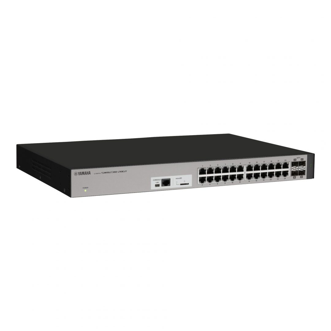 With high port counts and 10G uplink ports that can be used to transfer multichannel 96 kHz data over extended distances, the SWR2310-28GT and SWR2310-18GT switches have been designed to support safe, stable network operation in system backbone applications. Optional SFP-SWRT-SR and SFP-SWRT-LR small form-factor pluggable modules allow reliable long-distance communication of multiple channels of 96 kHz audio data, up to a maximum of 10 kilometers with the SFP-SWRT-LR, significantly enhancing performance, dependability, and flexibility for commercial installations, theaters, stadiums, and other large-scale installations.
