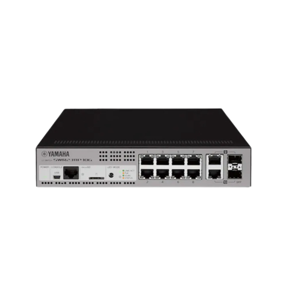 The “SWR2311P-10G” is an intelligent L2 switch that provides the ideal functionality for the “Dante” digital audio network that was developed by the Audinate Corporation and is now used world-wide, allowing construction of a stable network that simplifies settings, monitoring, management, and operation. When you connect the VXL1-16P to the SWR2311P-10G, optimal settings for Dante are made automatically via LLDP that is a protocol for passing system management data between a device and its neighboring device. PoE compliant ports can supply a maximum of 30W for all ports simultaneously. It can power not only PoE compliant devices such as the “MCP1” wall-mount controller used for controlling the volume of sound equipment used in conference rooms, or wireless access points, and can also provide ample power for driving even devices that require higher-output PoE such as the VXL1B-16P or VXL1W-16P.