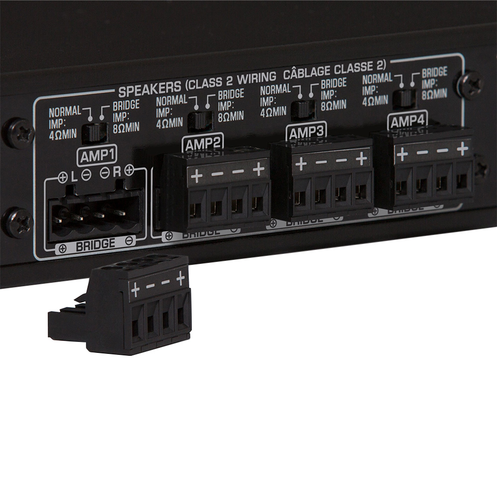 | Dynamic Power (1 kHz, 0.9% THD, All ch driven, 20 ms burst) | Normal (4 / 8 ohms): 80 / 50 W, Bridge (8 ohms):170 W |