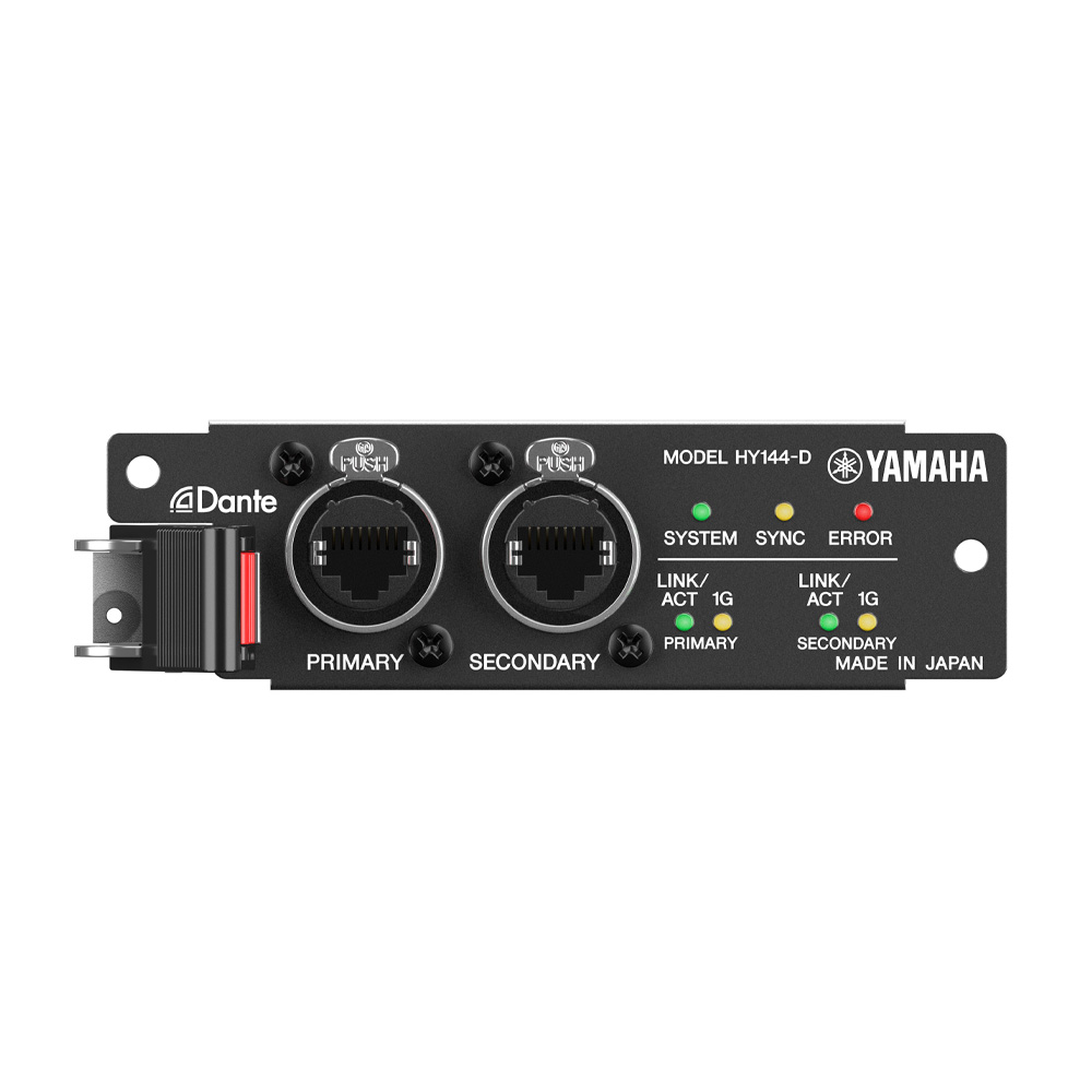 The HY144-D is a digital I/O card that is compatible with Dante digital audio networks. Up to 144 simultaneous input and output channels at 96 kHz/32 bits are supported.
