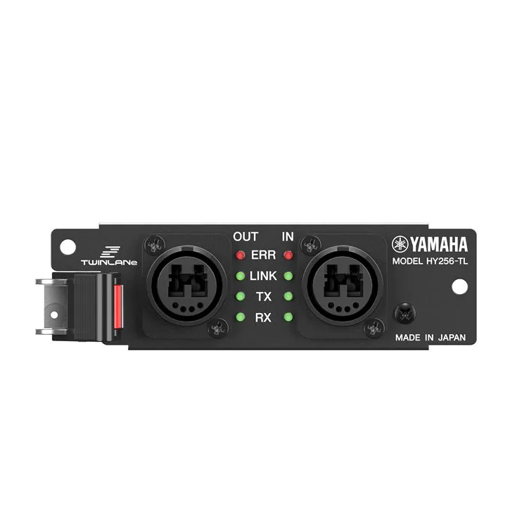 The HY256-TL is a digital I/O card that supports Yamaha’s TWINLANe audio network protocol. Up to 256 simultaneous input and output channels at 96 kHz/32 bits are available, and multi-mode fiber connections ensure reliable operation. Data can be reliably transferred between cards over distances of up to 300 meters.